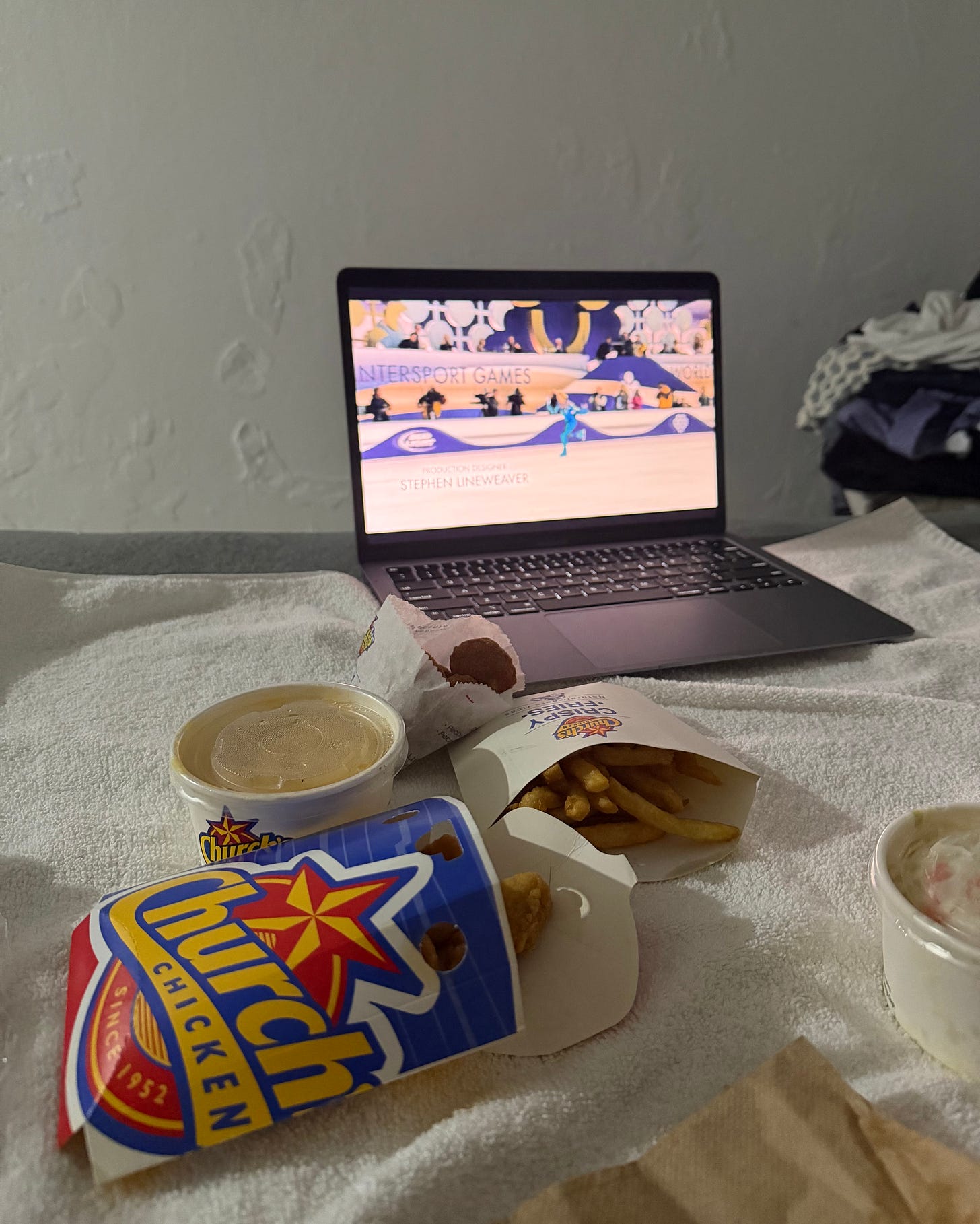 We walked three-quarters of a mile to pick up some regional fast food. We laid out a towel on the bed and ate between the skidmarked walls and billboard-covered window. I lazed in the terryclothed La Concha robe my boyfriend had stolen for me, eating mac ‘n’ cheese from a paper cup with a plastic spork, watching Blades of Glory off some free streaming site on his laptop. I felt very much in my element then, too.
